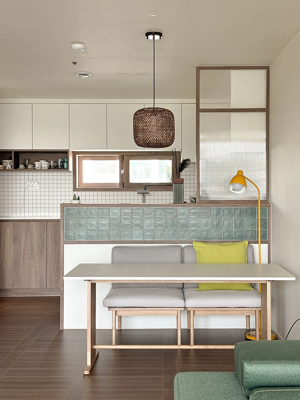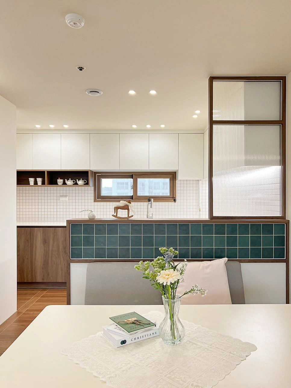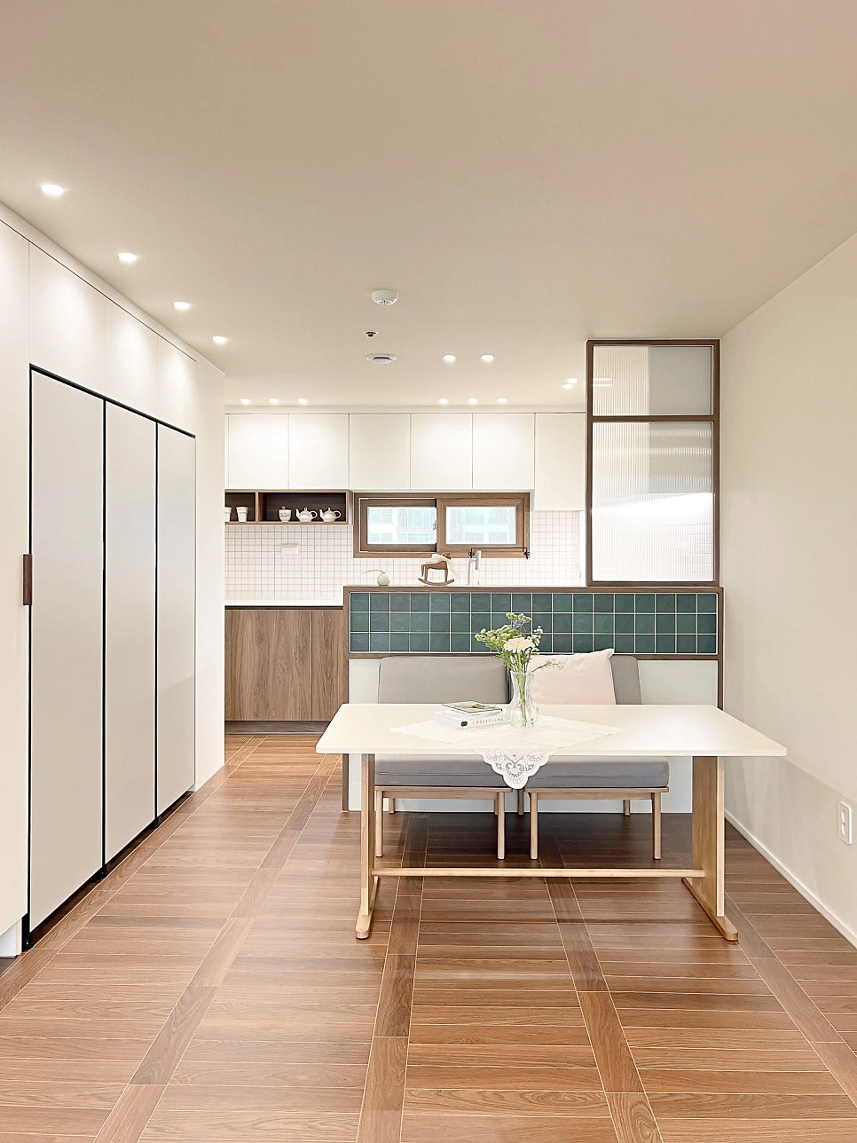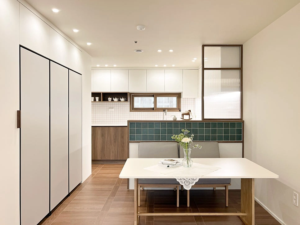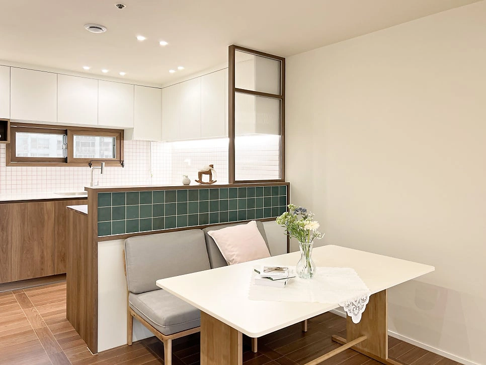 대청마루 패턴 마루, 그린 모자이크 타일, 제작 집성목 상판, 모루유리 파티션, 아치형 윈도우시트