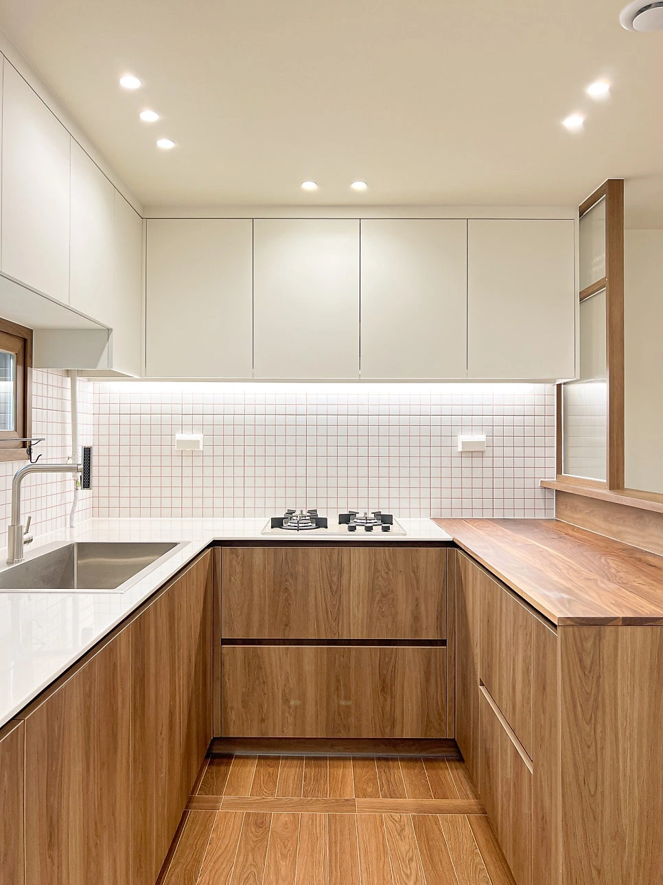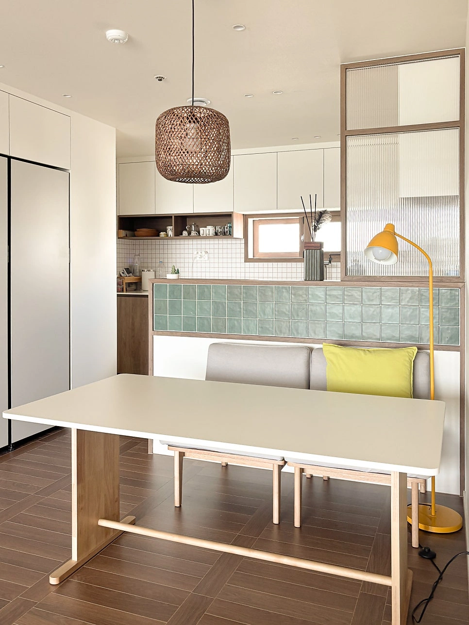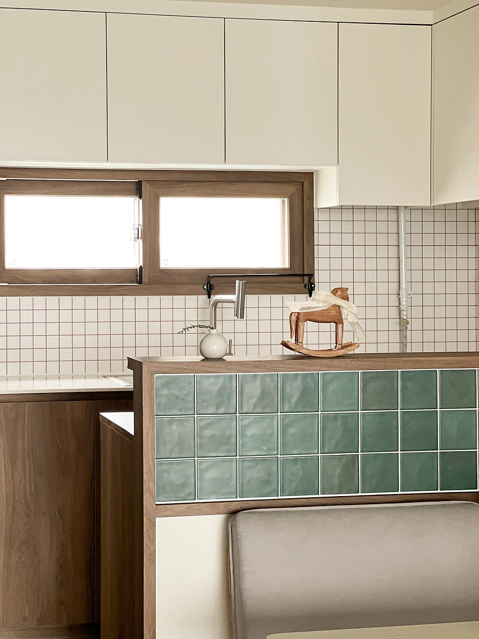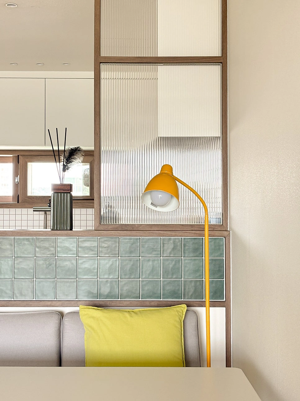 대청마루 패턴 마루, 그린 모자이크 타일, 제작 집성목 상판, 모루유리 파티션, 아치형 윈도우시트