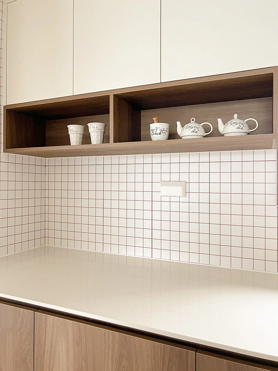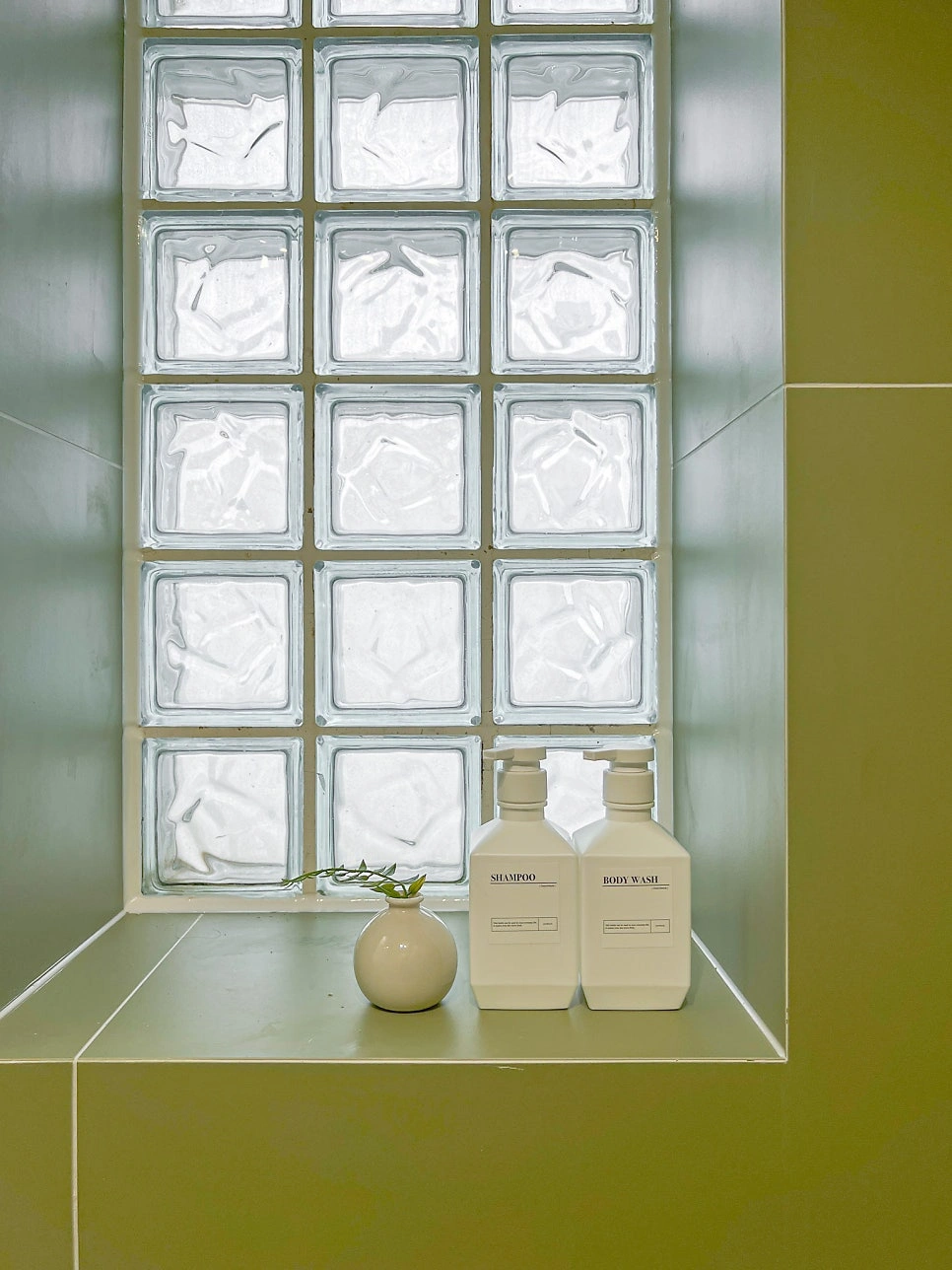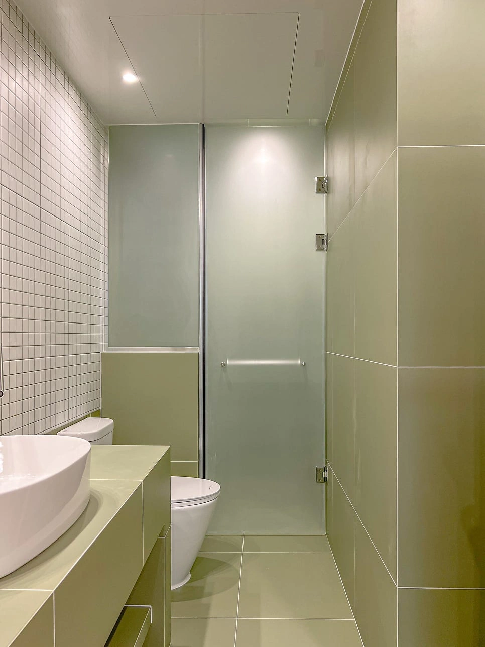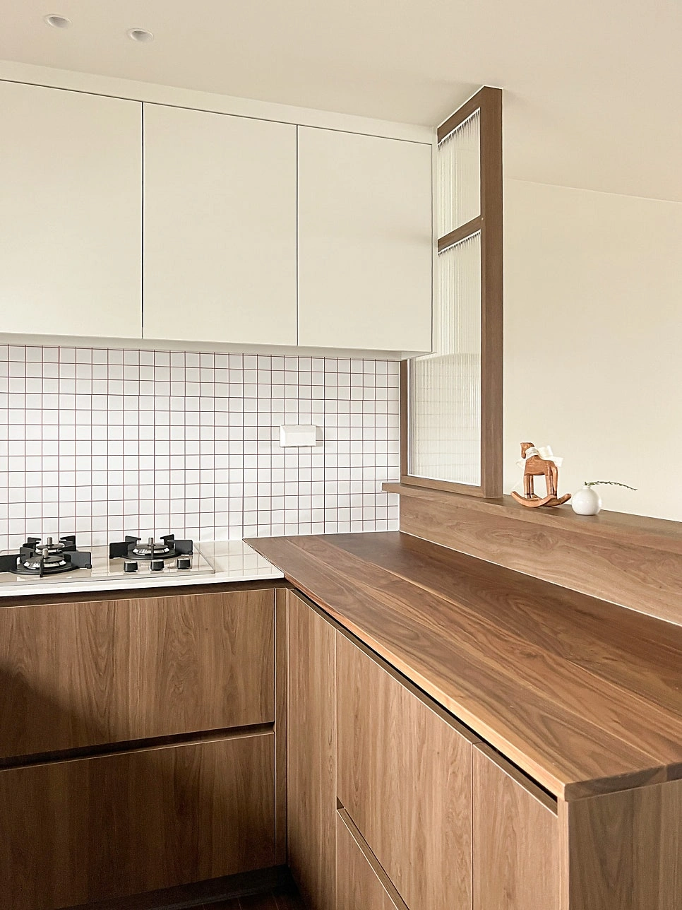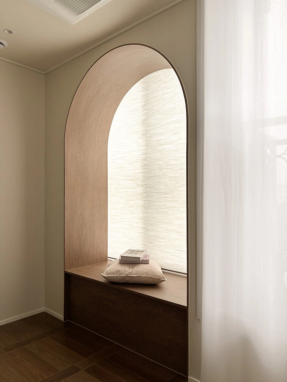 대청마루 패턴 마루, 그린 모자이크 타일, 제작 집성목 상판, 모루유리 파티션, 아치형 윈도우시트