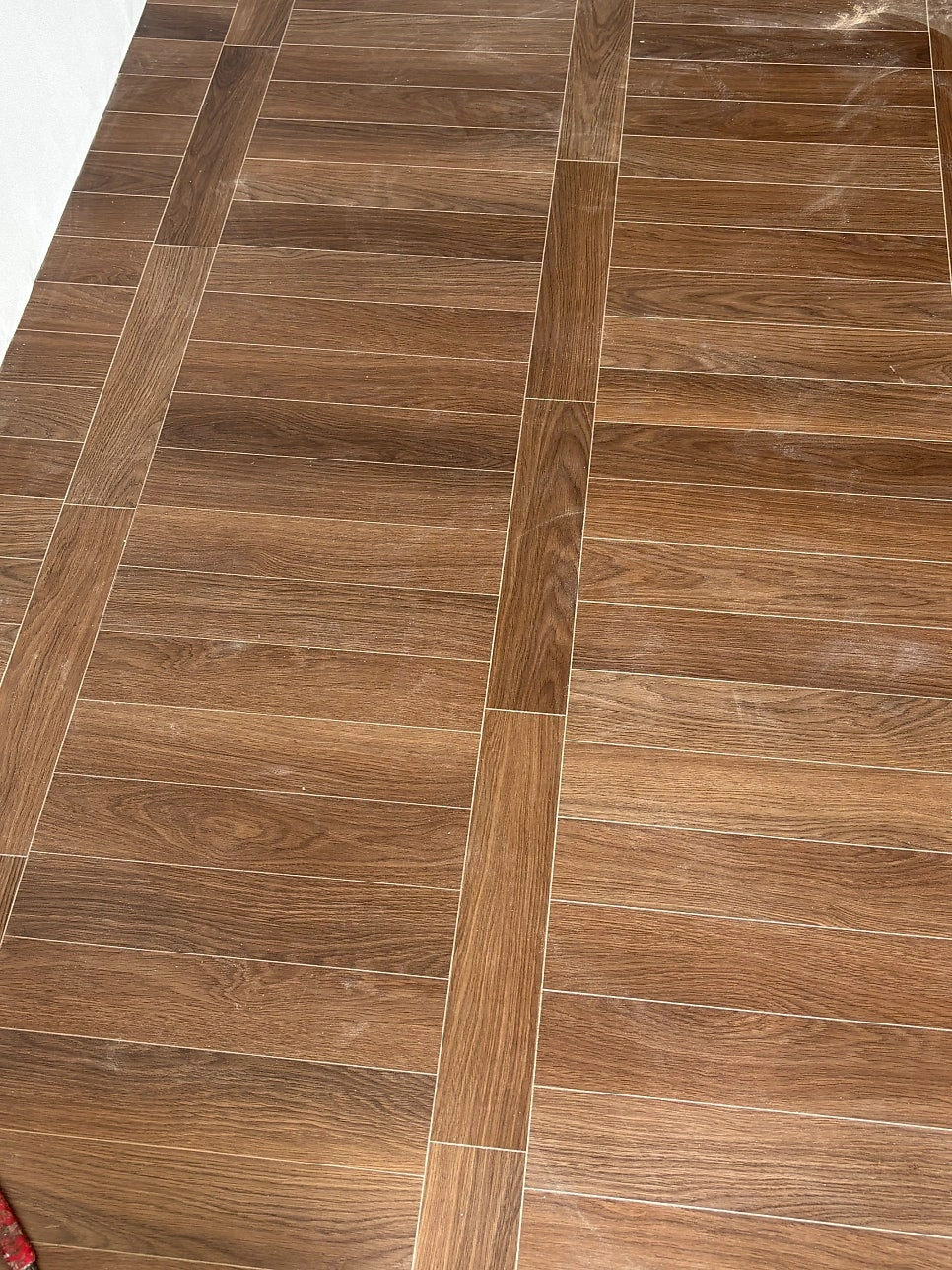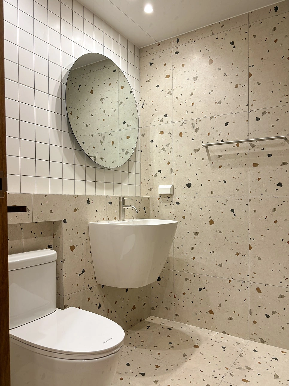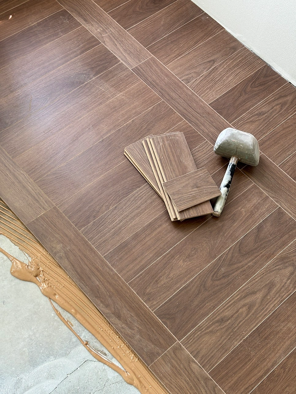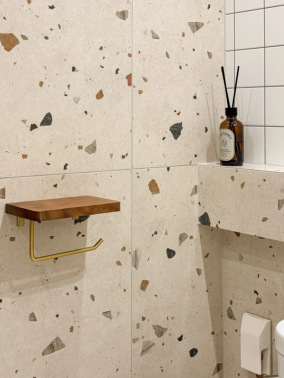 대청마루 패턴 마루, 그린 모자이크 타일, 제작 집성목 상판, 모루유리 파티션, 아치형 윈도우시트